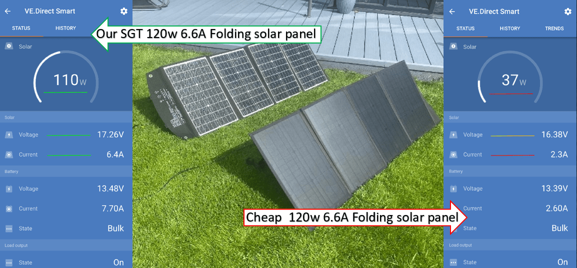 Both panels are advertised rated at 120w, 6.6A and 18v >90%